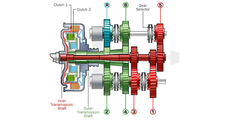 برای مثال در یک خودروی مجهز به جعبهدندهی ۶ سرعتهی dct، یک کلاچ با دندههای ۲،۴ و ۶ و کلاچ دیگر با دندههای اول، سوم، پنجم و عقب درگیر است. این طرح باعث میشود که خبری از اختلال ارتباط بین پیشرانه و گیربکس نباشد. همچنین گیربکس های dct برخلاف گیربکس های اتوماتیک دارای مبدل گشتاور نیستند.
